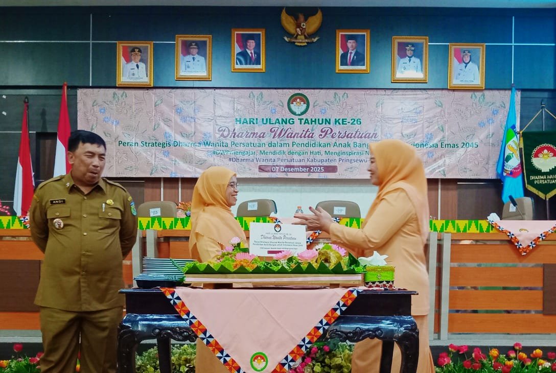 Bupati Pringsewu Riyanto Pamungkas, yang diwakili Sekretaris Daerah Ir. M. Andi Purwanto, S.T., M.T., mengajak seluruh anggota Dharma Wanita Persatuan (DWP) Kabupaten Pringsewu untuk menjadikan momentum HUT ke-26 DWP sebagai sarana merefleksi diri dan bersyukur. Selain itu, ia meminta agar ajang ini juga dimanfaatkan sebagai wadah pengembangan potensi para anggota guna menyongsong Indonesia Emas 2045. Ajakan tersebut disampaikan pada acara HUT ke-26 DWP di Aula Utama Kantor Bupati Pringsewu, hari Selasa (9/12/2025).